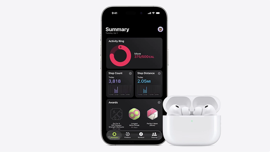 ถ้าใช้ร่วมกับแอป Apple Fitness+ AirPods Pro 3 สามารถดูตัวชี้วัดประสิทธิภาพแบบเรียลไทม์ได้โดยตรงบนหน้าจอ เช่น อัตราการเต้นของหัวใจ แคลอรี่ที่เผาผลาญ และความคืบหน้าของการออกกำลังกาย