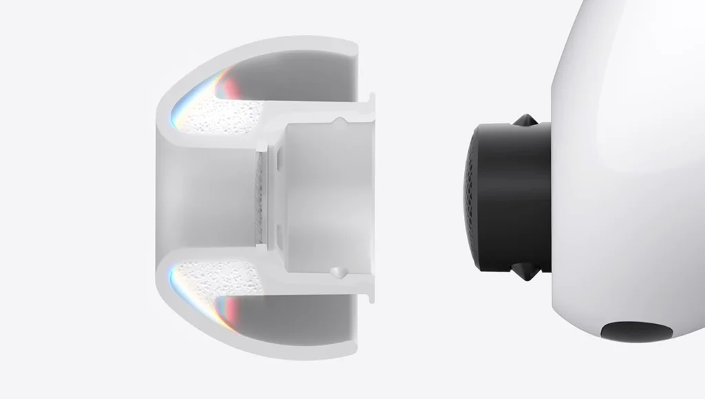 ขณะที่รูปทรงภายนอกของจุกหูฟังถูกจัดวางให้ตรงกับส่วนกลางของตัวหูฟัง ซึ่งเป็นการออกแบบที่อ้างอิงจากชุดข้อมูลกว่า 300 ล้านจุด ด้วยจุกหูฟังแบบซิริโคนใหม่ มีให้เลือก 5 ขนาด รวมถึงขนาด XXS ใหม่ จึงทำให้เวลาใส่ AirPods Pro 3 กระชับพอดีแบบอินเอียร์ หูฟังจะไม่หลุดหล่นง่ายๆ