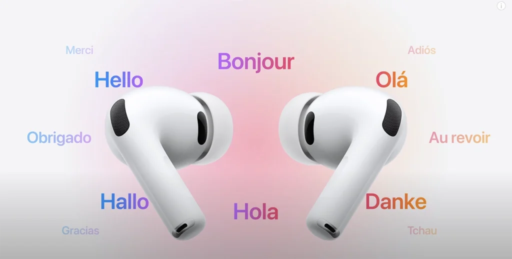 การเปิดใช้งานการแปลภาษาสดจะช่วยให้ผู้ใช้เข้าใจอีกภาษาและสื่อสารกับคนอื่นๆ ด้วยการพูดคุยอย่างเป็นธรรมชาติผ่าน AirPods และหากต้องโต้ตอบกับคนอื่นที่ไม่มีความสามารถแบบแฮนด์ฟรี ก็มีทางเลือกในการใช้ iPhone เป็นจอภาพตามแนวนอน ซึ่งจะช่วยแสดงการถอดเสียงของผู้ใช้ที่กำลังพูดคุยแบบสดๆ เป็นภาษาที่อีกฝ่ายต้องการ แล้วในตอนที่อีกฝ่ายโต้ตอบ AirPods ก็จะแปลคำพูดของพวกเขาเป็นภาษาที่ผู้ใช้ต้องการ