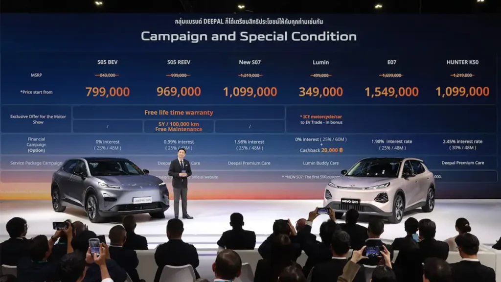 - Deepal E07 รับส่วนลดสูงสุดถึง 100,000 บาท*, ฟรี Lifestyle Package 60,000 บาท*, ฟรีอินเทอร์เน็ท 10 ปี* และฟรีแพ็คเกจ Deepal Premium Care*