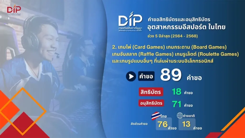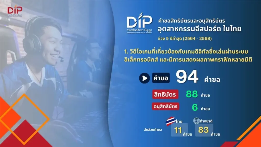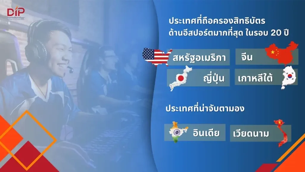 - เปิดเทรนด์สิทธิบัตร “อีสปอร์ต” โลกการแข่งขันที่ขับเคลื่อนด้วยนวัตกรรม ยกระดับเกมบนจอ สู่เศรษฐกิจดิจิทัลเต็มรูปแบบ