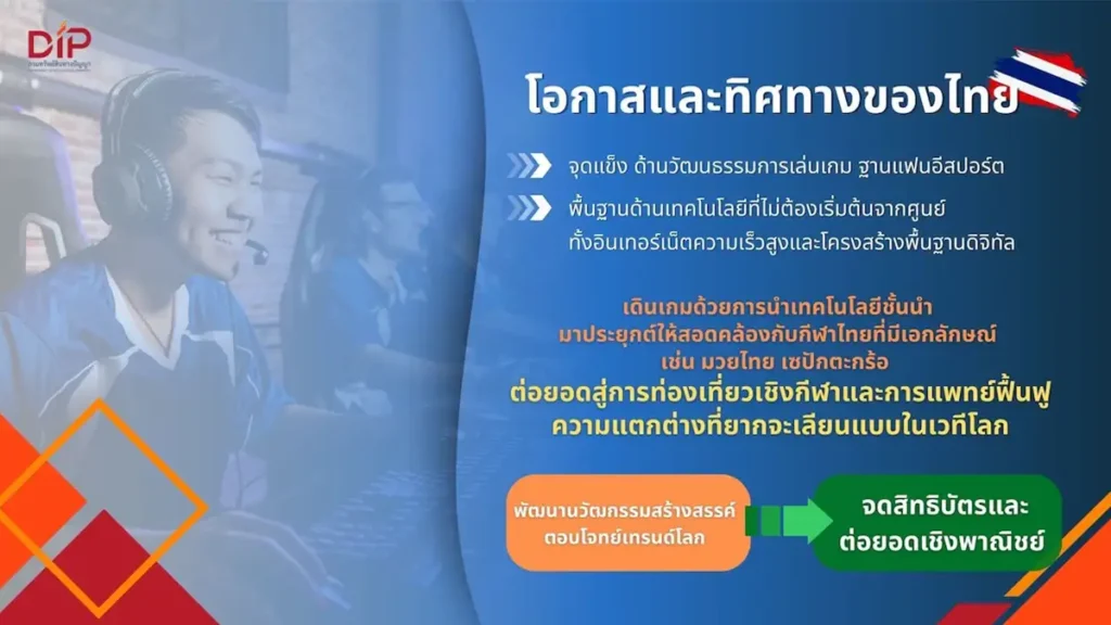 กรมทรัพย์สินทางปัญญา เผยอุตสาหกรรมอีสปอร์ตก้าวข้ามภาพจำของการเป็นเพียงกิจกรรมเพื่อความบันเทิง สู่การเป็นอุตสาหกรรมเทคโนโลยีที่มีมูลค่าสูง มี สิทธิบัตรเป็นตัวชี้วัดสำคัญ แนะไทยเร่งคว้าโอกาสพัฒนาสิทธิบัตรและต่อยอดใช้ประโยชน์เชิงพาณิชย์ ผสานจุดแข็งที่มี ทั้งฐานแฟนอีสปอร์ต โครงสร้างพื้นฐานดิจิทัล และกีฬาไทยที่มีอัตลักษณ์ เช่น มวยไทย ตะกร้อ เพื่อสร้างคอนเทนต์กีฬาอีสปอร์ตที่ทั่วโลกไม่สามารถลอกเลียนแบบได้