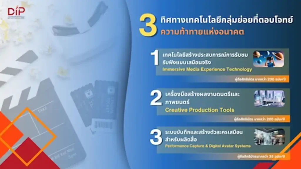อธิบดีกรมทรัพย์สินทางปัญญา กล่าวเพิ่มเติมว่า ปัจจุบันทิศทางเทคโนโลยีกลุ่มย่อยในอุตสาหกรรมภาพยนตร์และสื่อบันเทิง มุ่งพัฒนาใน 3 ด้านสำคัญ ที่ตอบโจทย์ความท้าทายและตลาดแห่งอนาคต ได้แก่