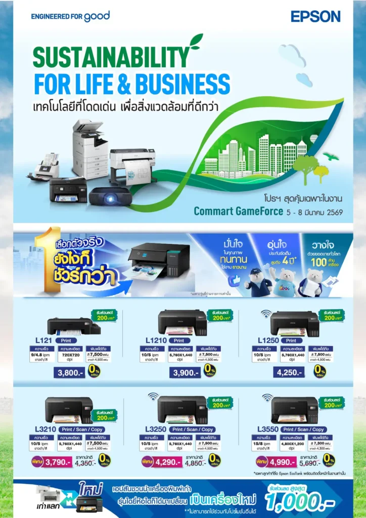 ท้ายสุดอีกหนึ่งสิทธิพิเศษสำหรับลูกค้าเอปสัน เพียงลงทะเบียนผลิตภัณฑ์ผ่านระบบ MyEpson สมาชิกจะได้รับการรับประกันสินค้าเพิ่มอีกขั้นต่ำ 3 เดือนหรือสูงสุดเพิ่มถึง 2 ปีจากระยะเวลาปกติ (ระยะเวลาที่ได้รับเพิ่ม ขึ้นกับประเภทผลิตภัณฑ์) พร้อมเข้าถึงข้อมูลการบริการและสิทธิประโยชน์ต่าง ๆ ของเอปสันได้อย่างสะดวก โดยสามารถลงทะเบียนได้ง่ายผ่านเว็บไซต์ https://my.epson.co.th พบกับข้อเสนอสุดคุ้มและทดลองใช้งานผลิตภัณฑ์ได้ที่บูธ Epson ฮอลล์ EH99 ในงาน Commart GameForce 2026 ระหว่างวันที่ 5 – 8 มีนาคม 2569 ณ ศูนย์นิทรรศการและการประชุมไบเทค บางนา