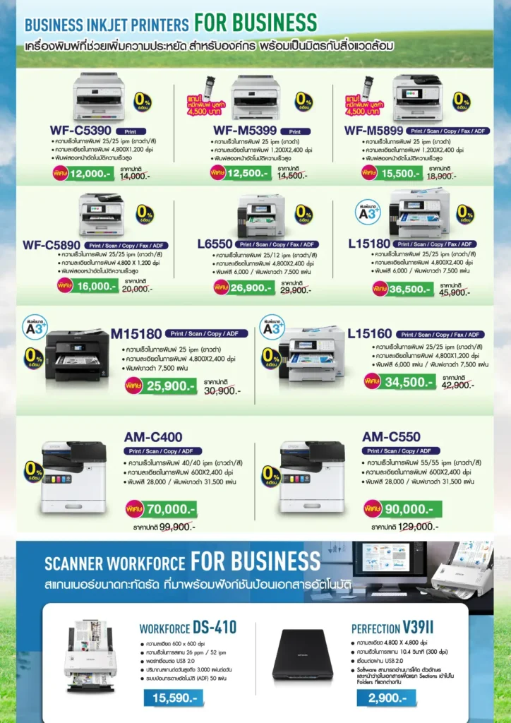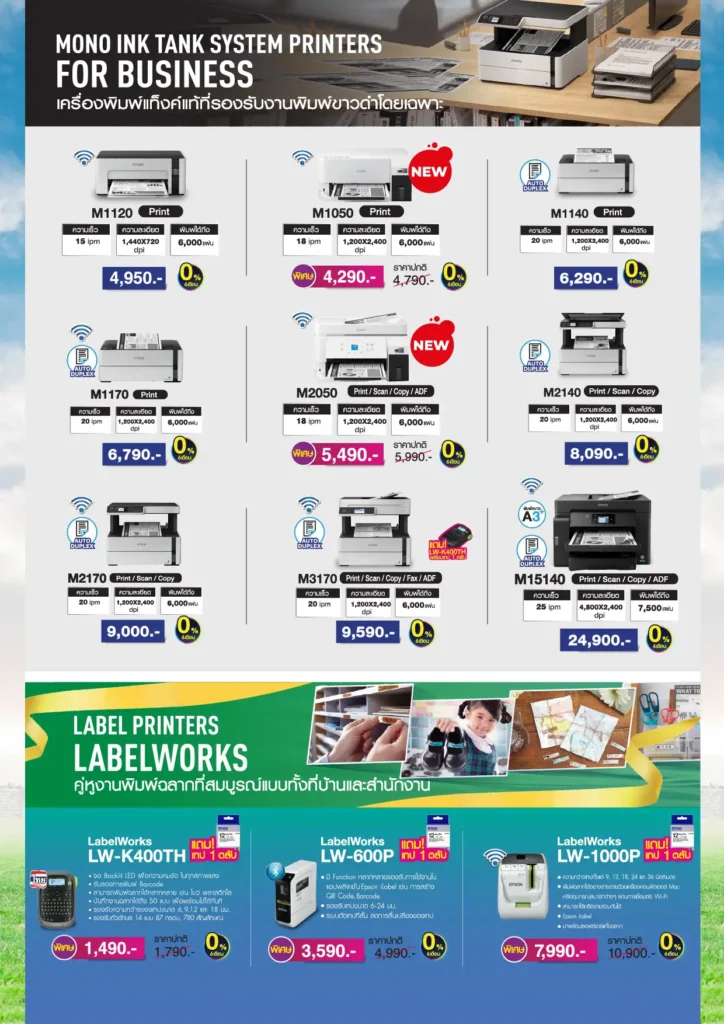 ภายในงาน เอปสันจัดโปรโมชั่นราคาพิเศษสำหรับเครื่องพิมพ์ยอดนิยมหลายรุ่น อาทิ EcoTank L121 ราคา 3,800 บาท L3210 ราคา 3,790 บาท L3250 ราคา 4,290 บาท และ L3550 ราคา 4,990 บาท พร้อมข้อเสนอผ่อนชำระ 0% นานสูงสุด 6 เดือน