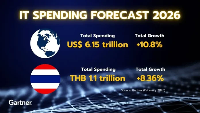สำหรับมูลค่าการใช้จ่ายไอทีของประเทศไทยในปีนี้ (2569) การ์ทเนอร์คาดการณ์ว่าจะมียอดสูงเกือบ 1.1 ล้านล้านบาท เพิ่มขึ้น 8.36% จากปี 2568