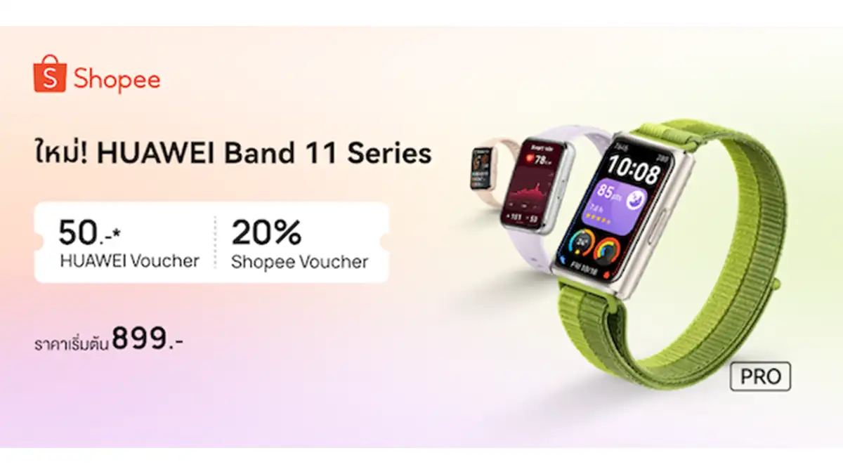 HUAWEI Band 11 Series ราคาเริ่มต้นเพียง 899 บาท มีให้เลือก 2 รุ่น ได้แก่ HUAWEI Band 11 Pro พร้อม 3 สีสันโดนใจ และ HUAWEI Band 11 ในรุ่นอะลูมิเนียมอัลลอยที่มีให้เลือก 5 สี และรุ่นโพลิเมอร์ 2 สี เปิดวางจำหน่ายที่ HUAWEI Official Store บน Shopee ในวันที่ 3 มีนาคม 2569 เวลา 00.00 น.พร้อมข้อเสนอเอ็กซ์คลูซีฟสุดคุ้มทั้ง