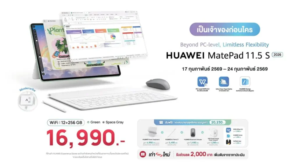 HUAWEI MatePad 11.5 S 2026 รุ่น Wi-Fi (12GB+256GB) จำหน่ายในราคาสุดคุ้มเพียง 16,990 บาท มีให้เลือก 2 สี ได้แก่ สี Green และสี Space Gray และพิเศษหากซื้อในช่วงโปรโมชั่น ระหว่างวันที่ 17 กุมภาพันธ์ 2569 – 24 กุมภาพันธ์ 2569 รับไปเลยประสบการณ์ PC-Like แบบครบเซ็ตในมูลค่ารวมทั้งหมด 20,230 บาท ได้แก่ HUAWEI Smart Keyboard มูลค่า 4,990 บาท, HUAWEI M-Pencil 3 มูลค่า 4,490 บาท, HUAWEI Bluetooth Mouse มูลค่า 1,490 บาท และ 40W SuperCharge Power Adapter มูลค่า 1,290 บาท นอกจากนี้ยังติดตั้งโปรแกรมให้ฟรี ได้แก่ WPS Office 3.0 มูลค่า 3,990 บาท, HUAWEI Notes มูลค่า 1,990 บาท และ GoPaint App มูลค่า 1,990 บาท พิเศษยิ่งกว่าสำหรับลูกค้าเก่าแลกใหม่ รับส่วนลด 2,000 บาท เพิ่มเติมจากราคาประเมิน สามารถสั่งซื้อได้ที่ HUAWEI Experience Store และร้านค้าที่ร่วมรายการทั้งออฟไลน์และออนไลน์ รวมถึง HUAWEI Store และร้านค้าอย่างเป็นทางการของหัวเว่ยบนแพลตฟอร์ม Lazada, Shopee และ TikTok Shop
