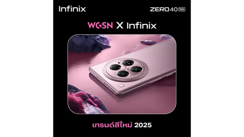 ZERO 40 5G เป็นสมาร์ทโฟนเรือธงของอินฟินิกซ์ที่ได้รับการออกแบบให้เป็นผู้นำด้านสไตล์ โดยร่วมมือกับ WGSN (World Global Style Network) ผู้นำด้านการคาดการณ์เทรนด์ระดับโลกร่วมคิดค้นและวิจัยได้มาซึ่งโทนสีสำหรับสมาร์ทโฟนในปี 2025 ได้แก่ สี Violet Garden โดยตัวเครื่องมีสัมผัสที่โดดเด่นด้วยพื้นผิวด้านคล้ายกำมะหยี่ ด้านหลังของตัวเครื่องได้รับการออกแบบภายใต้แนวคิด “Storyline” ที่ใช้เส้นแบ่งให้เห็นถึงความแตกต่างของพื้นผิวแม้จะเป็นโทนสีเดียวกัน พร้อมกับสร้างเลเยอร์บนตัวเครื่องที่สวยงามเพื่อสื่อถึงความสมบูรณ์แบบและความสุนทรีย์ของชีวิต