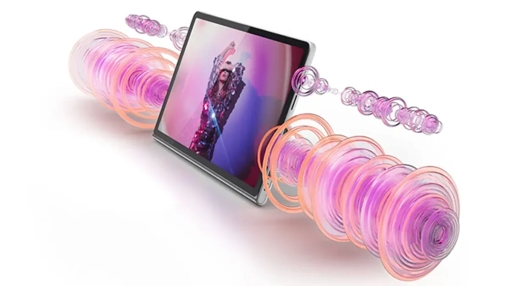 Lenovo Tab Plus ดีไซน์มาเพื่อเอาใจคนรักเสียงดนตรี ที่จะเปลี่ยนทุกที่ให้เป็นแหล่งรวมความบันเทิงส่วนตัวด้วยเสียงสเตอริโอคมชัด 26W จากลำโพง JBL Hi-Fi ถึง 8 ตัว รวมถึงทวีตเตอร์เมทริกซ์ 4 ตัว และอีก 4 วูฟเฟอร์สมดุลแรงในกล่องลำโพง 4 ตัว รวมแล้ว 22cc เติมสีสันให้บรรยากาศในห้องนอนหรือห้องนั่งเล่นมีชีวิตชีวายิ่งขึ้น ด้วยเสียงเบสที่ลึกและโดดเด่นแต่ยังคงความคมชัดของโทนเสียงจาก Dolby Atmos พร้อมรองรับความถี่ละเอียดสูงถึง 24 บิต และ 96kHz เมื่อใช้หูฟัง หรือจะเปลี่ยนเป็นลำโพง Bluetooth เพื่อสตรีมผ่านสมาร์ทโฟนก็ได้เช่นกัน นอกจากนี้แท็บเล็ตยังมีขาตั้งในตัวปรับได้สูงสุด 175 องศา เพิ่มความยืดหยุ่นในการรับชม และผู้ใช้สามารถปรับแต่งการตั้งค่าเสียงได้ตามความต้องการสำหรับแอพพลิเคชันต่างๆ ได้อีกด้วย