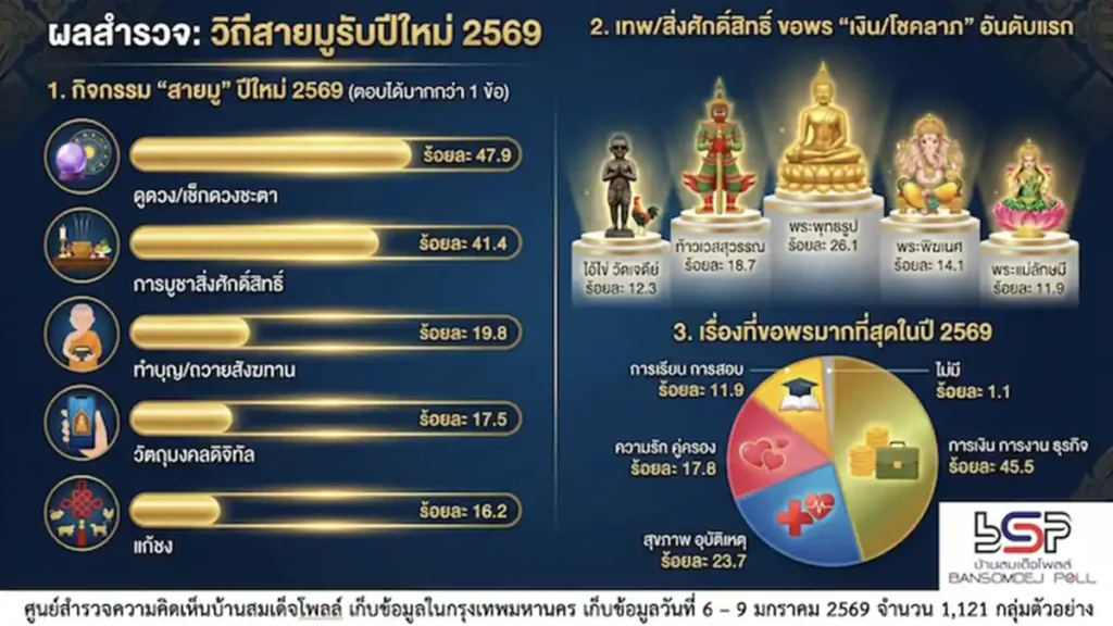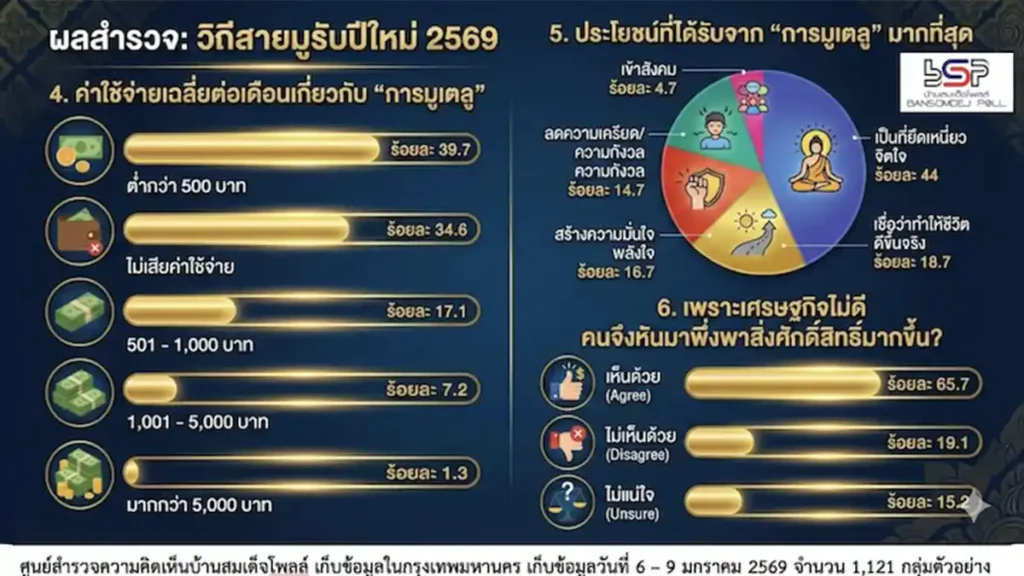 บ้านสมเด็จโพลล์เผย 44 % คนกทม คิดว่าการมูเตลู เป็นที่ยึดเหนี่ยวจิตใจ ปีใหม่ 2569 เน้น ดูดวง/เช็กดวงชะตา ไปมูขอเรื่องการเงิน การงาน ธุรกิจ มากที่สุด