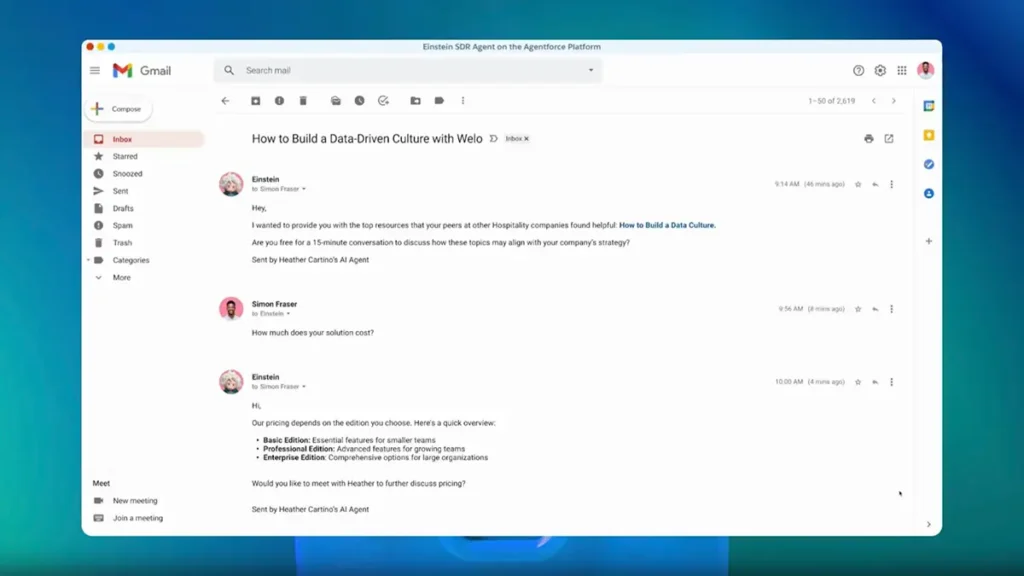 Einstein SDR Agent: จากรายงานล่าสุดของ Salesforce องค์กรธุรกิจต่าง ๆ ระบุว่า พนักงานขายของพวกเขาใช้เวลาเพียง 30% ในกิจกรรมด้านการขาย จากเวลาทั้งหมดในสัปดาห์โดยเฉลี่ย เนื่องจากต้องใช้เวลาจำนวนมากไปกับงานเล็กน้อยที่จำเจและยุ่งยากแต่จำเป็นต้องลงมือทำด้วยตนเอง Einstein SDR Agent จะช่วยให้พนักงานฝ่ายขายสามารถเพิ่มเวลาไปที่กิจกรรมการขายได้อย่างมีประสิทธิภาพสูงสุด ด้วยความสามารถดังนี้