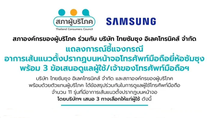 หลังจากที่ผู้ใช้มือถือซัมซุงประสบปัญหาหน้าจอขึ้นเส้นเขียว มีการร้องเรียนถึงสภาองค์กรของผู้บริโภค กว่า 1 ปี ล่าสุด สภาองค์กรของผู้บริโภคและซัมซุง ออกแถลงการณ์ร่วมชี้แจงกรณีปัญหา พร้อม 3 ข้อเสนอดูแลผู้ใช้โทรศัพท์มือถือซัมซุงทั้ง 11 รุ่น