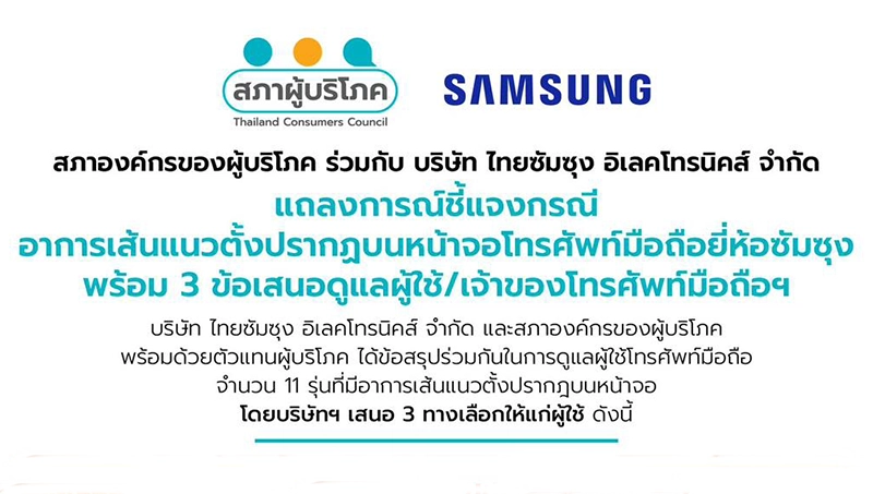 ในแถลงการร์ร่วมกรณีอาการเส้นแนวตั้งปรากฏบนหน้าจอโทรศัพท์มือถือ ยี่ห้อ ซัมซุง นั้น ทางบริษัท ไทยซัมซุง อิเลคโทรนิคส์ จำกัด และ สภาองค์กรของผู้บริโภค พร้อมด้วยตัวแทนผู้บริโภค ได้ข้อสรุปร่วมกันในการดูแลผู้ใช้โทรศัพท์มือถือจำนวน 11 รุ่นที่มีอาการเส้นแนวตั้งปรากฎบนหน้าจอ โดยบริษัทฯ เสนอ 3 ทางเลือกให้แก่ผู้ใช้ ดังนี้