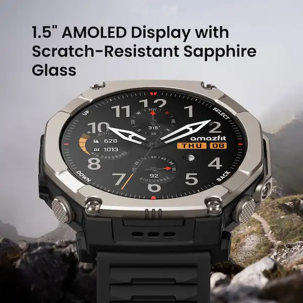 - ตัวเรือน Amazfit T-Rex Ultra 2 แข็งแกร่งด้วยวัสดุไทเทเนียมเกรด 5 กระจกหน้าจอแซฟไฟร์ พร้อมมาตรฐานกันน้ำลึก 100 เมตร