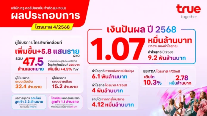 ทรู คอร์ปอเรชั่น เดินหน้าสร้างผลกำไรอย่างต่อเนื่องเป็นไตรมาสที่ 4 ติดต่อกัน พร้อมจ่ายเงินปันผล 4.1 พันล้านบาท สำหรับไตรมาส 4/2568